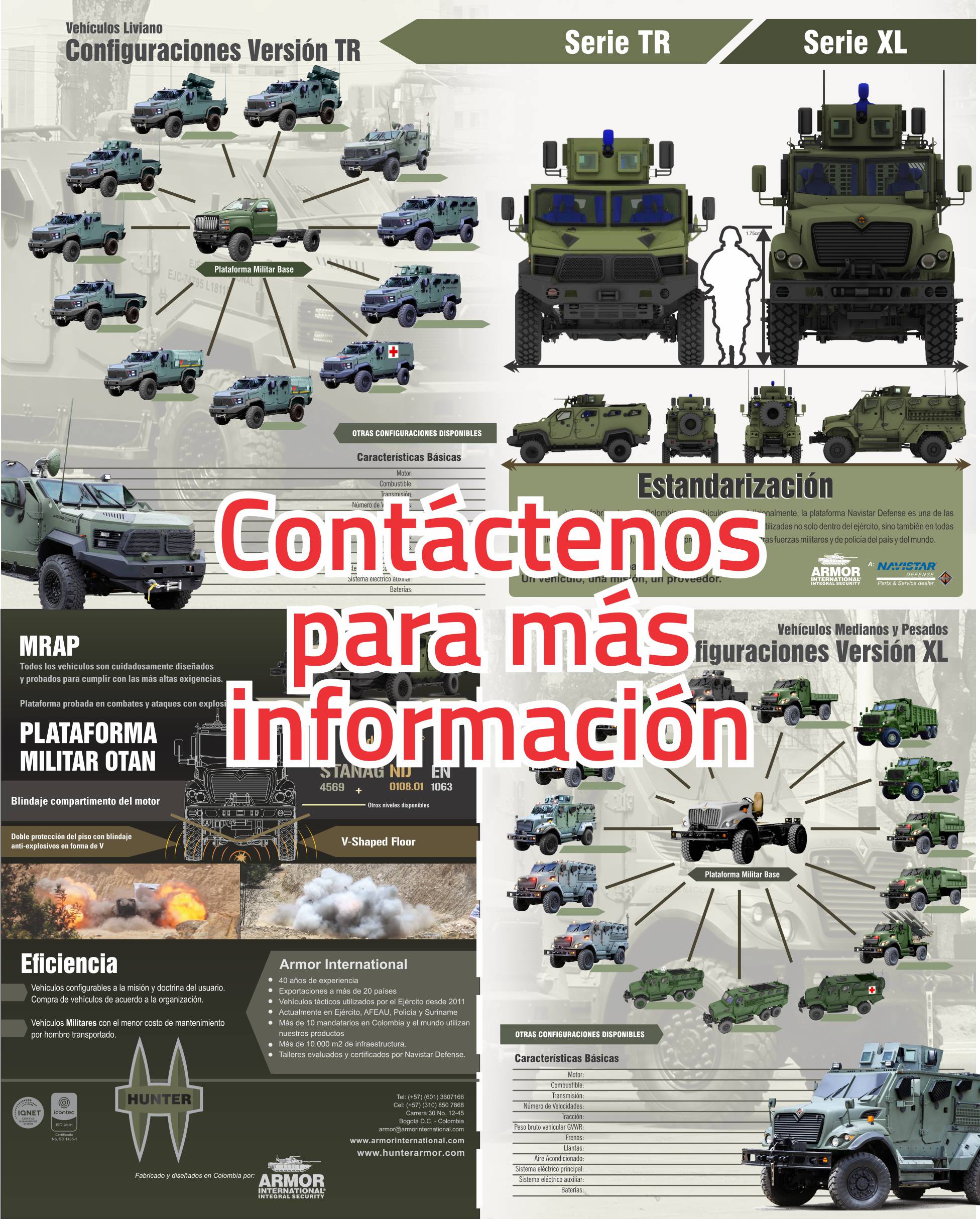 Los Hunter Anti-motines pueden transportar desde 12 o más personas en su interior con una excelente protección contra armas largas como fusiles. Su tracción 4x4 le permite llegar a lugares remotos. Gracias a su configuración técnica es un vehículo confiable para largos recorridos. Cuenta con un potente motor Diesel y la más avanzada tecnología en llantas para garantizar la mejor movilidad. El vehículo Táctico Anti-motines Hunter lo llevará a usted a donde tenga que llegar.